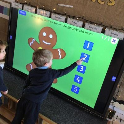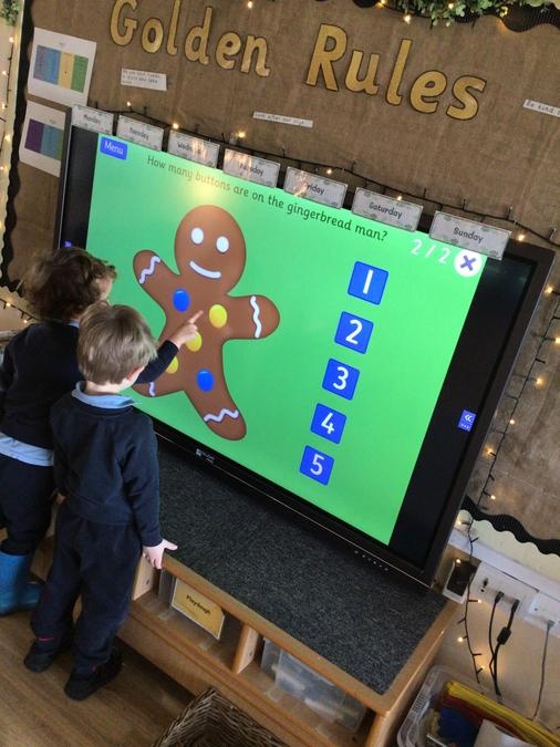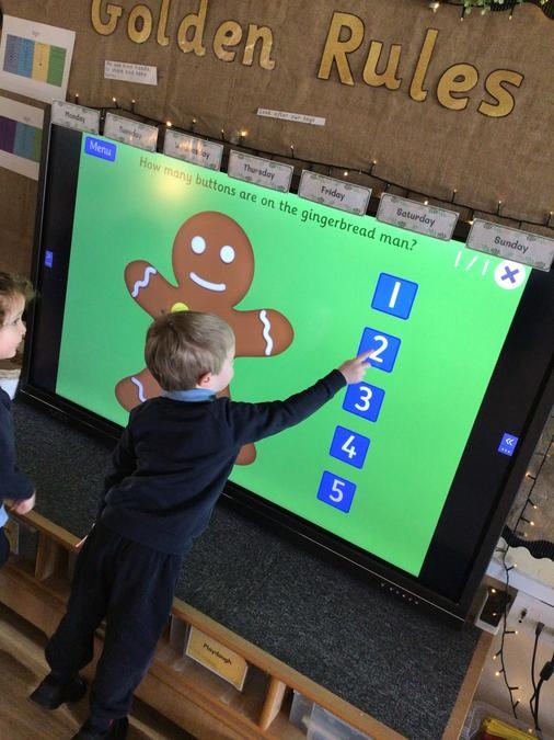 We have been using the whiteboard to practice our subitising skills to 5. We had to recognise how many buttons were on the Gingerbread Man!